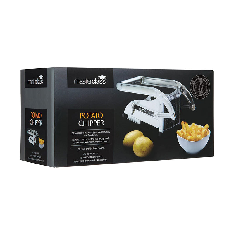 Prepare lovely, straight chips in seconds with the Master Class Stainless Steel Potato Chipper. With its easy lever arm action, it only takes a gentle push to cut a potato into as many as 36 evenly sized chips (or 64 French fries!). It’s so much easier than using a knife. Best of all, with its heavy-duty stainless steel design and durable lever mechanism, this is a tool that’s designed to last. You can use this potato chipper to make fantastic chips and French fries but also it can be used to create vegetable strips such as carrot sticks. Easy to clean, the cutter also features a rubber suction pad to grip work surfaces when in use.