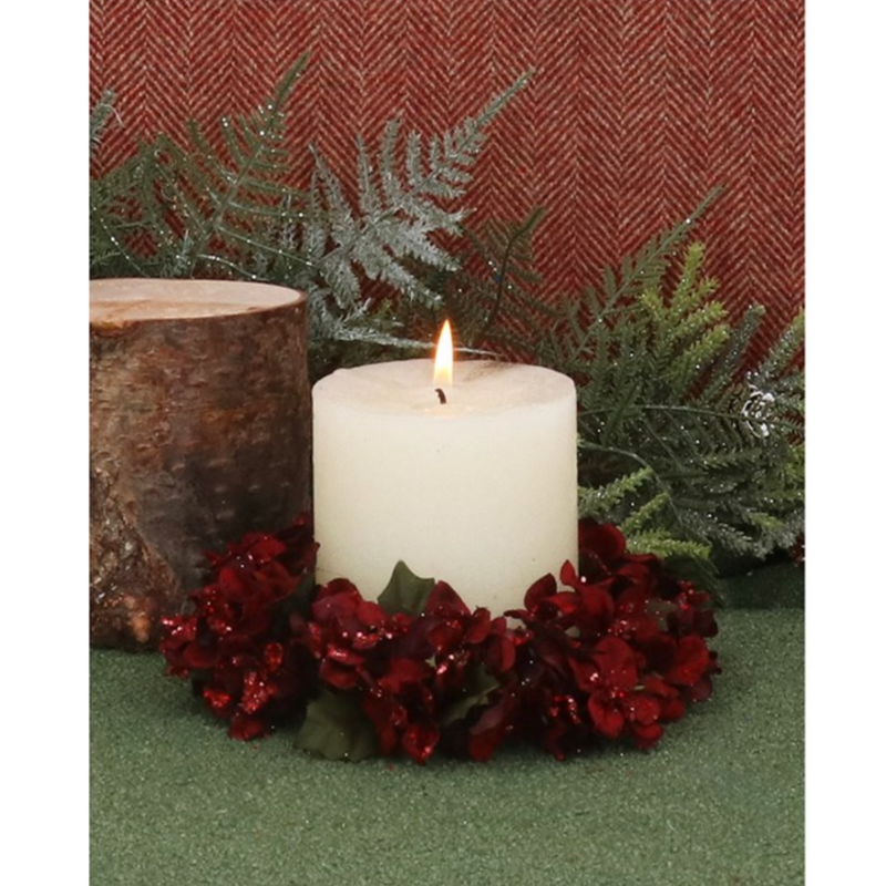 The Burgundy Hydrangea Acrylic Candle Ring adds woodland elegance to your holiday decor. Its rich burgundy flowers and green leaves encircle candles beautifully, creating a warm, festive touch for tabletops or mantels. Durable and versatile, it suits various candle styles for lasting seasonal charm.