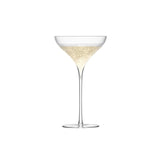 A pair of mouth-blown LSA Savoy Pair of Champagne Saucers with fine, curved bowls. A deep, V-shaped 'sparkle point' in the hand-drawn stem enhances bubbles as they travel up the bowl.