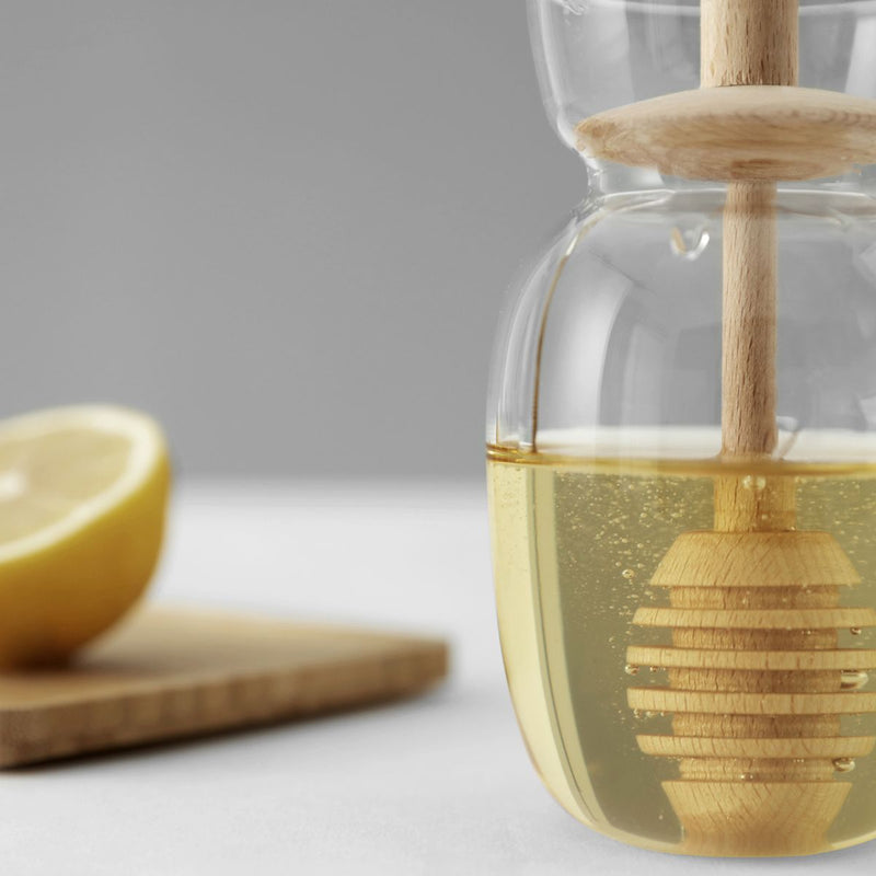 Add a touch of sweetness to your day and your tea with the Minima Honey Jar. Designed to seamlessly introduce that perfect touch of honey, this jar ensures each cup is enhanced just the right amount. Life, like tea, deserves a hint of sweetness. Crafted from borosilicate glass and wood. Capacity: 300 ml. Elegantly presented in a gift box.