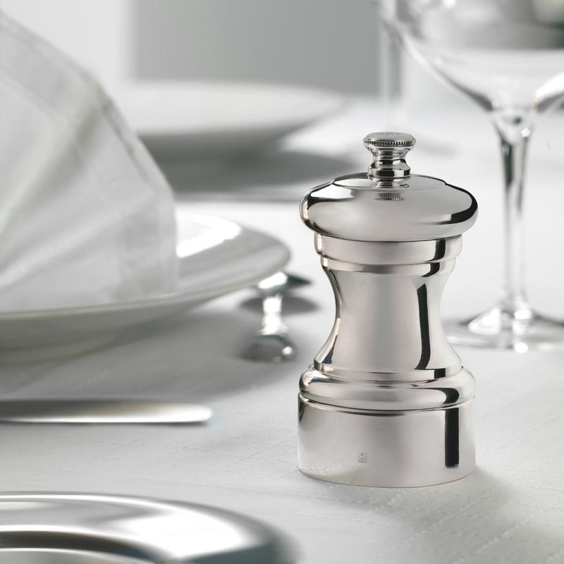 A wonderful addition to any table's silverware, and they do not come more classic than this reproduction of a Peugeot model dating back to 1874. Made of silver-plated metal to the highest standard recognised by French law, it bears a hallmark as an indicator of its high quality. Yet this classic design houses a thoroughly modern grinding mechanism so you still enjoy the characteristic perfect grind you expect from a Peugeot mill. To maintain the shine, simply buff with a chamois or suitable silver cleaning cloth.