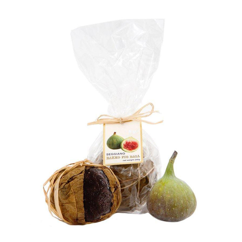 From Cosenza, Calabria, in southern Italy, the fig ball is a traditional and ingenious way of preserving the juicy Dottato variety of figs that are unique to this region. The figs are picked from the tree when they are well matured, dried and slowly cooked in their own juices. Shaped into balls, wrapped in green fig leaves and slow baked.