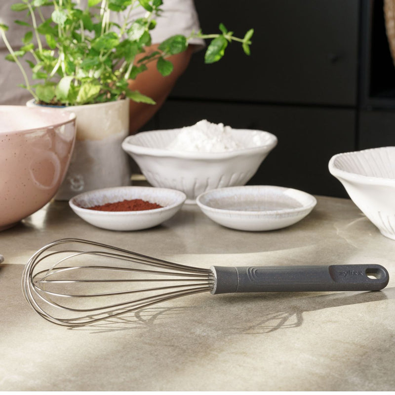 The Large Balloon Whisk is the perfect interpretation of a classic whisk. It has a thick and ergonomically shaped handle with practical grip lines, to ensure a firm hold even when wet or during prolonged use. It is dishwasher safe, comes with a 5-year guarantee, and the ergonomic handles are made from a sustainable wheat straw material reducing the use of virgin plastic by 50%.